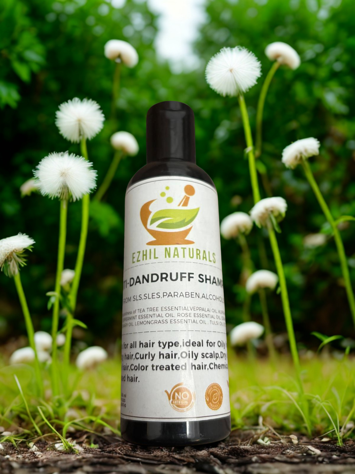 Ezhil Naturals Herbal Anti-Dandruff Shampoo is a powerful blend of seven essential oils that work together to cleanse, soothe, and restore scalp health — naturally and effectively.